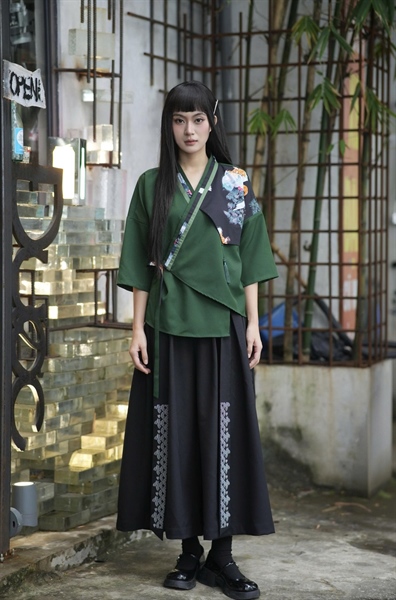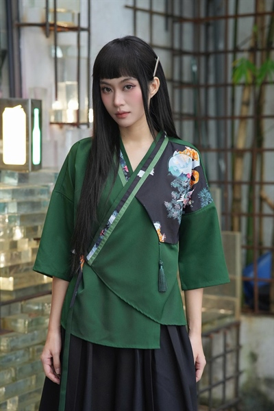 Quả áo ghép vải phải nói là xụm nụ, kì công và tỉ mỉ vô cùng luôn á cả nhà. Sau lưng cũng được phối dãy hình chữ nhật giống hoạ tiết với mặt trước, cùng phần viền và khoen móc tạo điểm nhấn hài hoà cả trước và sau áo.